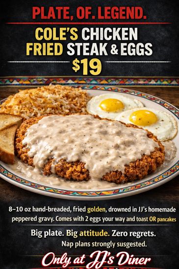 8-10 oz hand-breaded in JJ's own house made breading and fried to perfection, smothered in JJ's homemade peppered cream gravy, house seasoned hashbrowns, 2 eggs your way and 2 pieces of toast or 2 pancakes.
